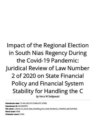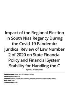 Impact of the Regional Election in South Nias Regency During the Covid-19 Pandemic_ Juridical Review of Law Number 2 of 2020 on State Financial Policy and Financial System Stability for Handling the C(orig.pdf Download (1MB) | Preview |