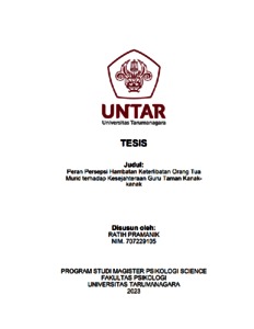 Pramanik, Ratih (2023) Peran Persepsi Hambatan Keterlibatan Orang Tua Murid Terhadap Kesejahteraan Guru TK. Masters thesis, Universitas Tarumanagara.