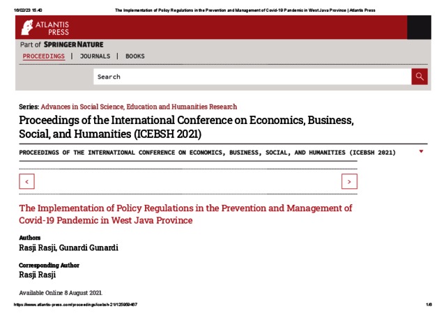 Rasji, Rasji and Gunardi, Lie (2021) The Implementation of Policy Regulations in the Prevention and Management of Covid-19 Pandemic in West Java Province. Proceedings of the International Conference on Economics, Business, Social, and Humanities (ICEBSH 2021). ISSN 2352-5398
