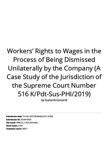 Kosim, Kevin and Gunardi, Gunardi (2021) Turnitin : Workers’ Rights to Wages in the Process of Being Dismissed Unilaterally by the Company (A Case Study of the Jurisdiction of the Supreme Court Number 516 K/Pdt-Sus-PHI/2019). TICASH 2021.