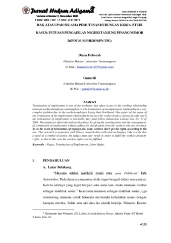 Deborah, Diana and Gunardi, Gunardi (2021) Hak Atas Upah Selama Pemutusan Hubungan Kerja (Studi Kasus: Putusan Pengadilan Negeri Tanjung Pinang Nomor 26/PDT.SUS-PHI/2019/PN TPG). Jurnal Hukum Adigama, 4 (2). ISSN 2655-7347