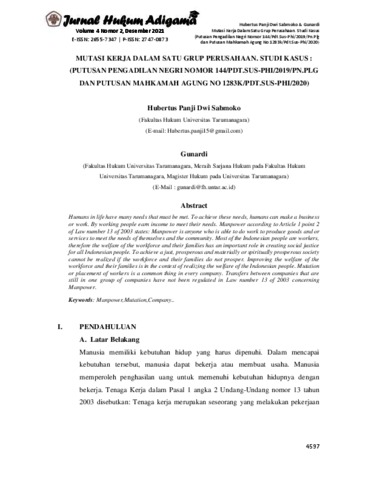 Sabmoko, Hubertus Panji Dwi and Gunardi, Gunardi (2021) MUTASI KERJA DALAM SATU GRUP PERUSAHAAN. STUDI KASUS : (PUTUSAN PENGADILAN NEGRI NOMOR 144/PDT.SUS-PHI/2019/PN.PLG DAN PUTUSAN MAHKAMAH AGUNG NO 1283K/PDT.SUS-PHI/2020). Jurnal Hukum Adigama, 4 (2). ISSN E: 2655-7347, P: 2747-0873