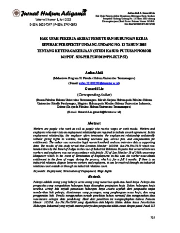 Ahdi, Aufan and Gunardi, Lie (2022) HAK UPAH PEKERJA AKIBAT PEMUTUSAN HUBUNGAN KERJA SEPIHAK PERSPEKTIF UNDANG-UNDANG NO. 13 TAHUN 2003 TENTANG KETENAGAKERJAAN (STUDI KASUS: PUTUSAN NOMOR 162/PDT. SUS-PHI.PLW/2019/PN.JKT.PST). Jurnal Hukum Adigama, 5 (1). ISSN E: 2655-7347, P: 2747-0873