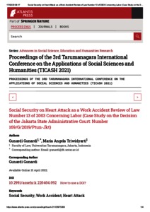 Gunardi, Gunardi Social Security on Heart Attack as a Work Accident Review of Law Number 13 of 2003 Concerning Labor (Case Study on the Decision of the Jakarta State Administrative Court: Number 169/G/2019/Ptun-Jkt). Proceedings of the 3rd Tarumanagara International Conference on the Applications of Social Sciences and Humanities (TICASH 2021).