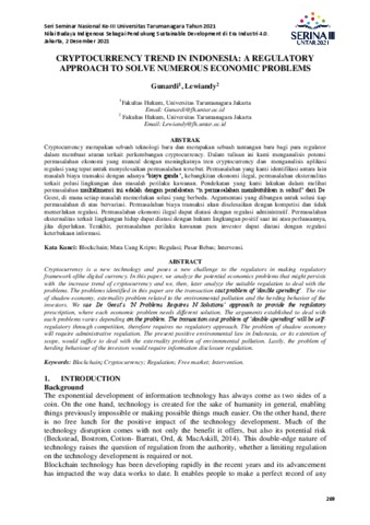Gunardi, Gunardi and Lewiandy, Lewiandy (2021) CRYPTOCURRENCY TREND IN INDONESIA: A REGULATORY APPROACH TO SOLVE NUMEROUS ECONOMIC PROBLEMS. SERINA III Untar 2021. ISSN 2809-509X