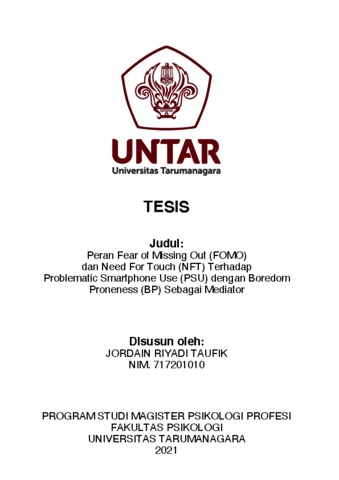 Taufik, Jordain Riyadi (2023) Peran Fear of Missing Out (FOMO) dan Need For Touch (NFT) Terhadap Problematic Smartphone Use (PSU) dengan Boredom Proneness (BP) Sebagai Mediator. Masters thesis, Universitas Tarumanagara.