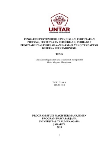 DJAYA, TAWI (2022) PENGARUH PERTUMBUHAN PENJUALAN, PERPUTARAN PIUTANG, PERPUTARAN PERSEDIAAN, TERHADAP PROFITABILITAS PERUSAHAAN FARMASI YANG TERDAFTAR DI BURSA EFEK INDONESIA. Masters thesis, Universitas Tarumanagara.