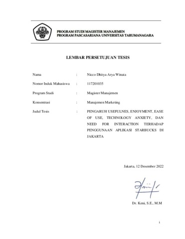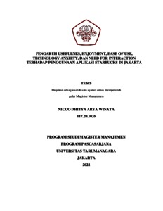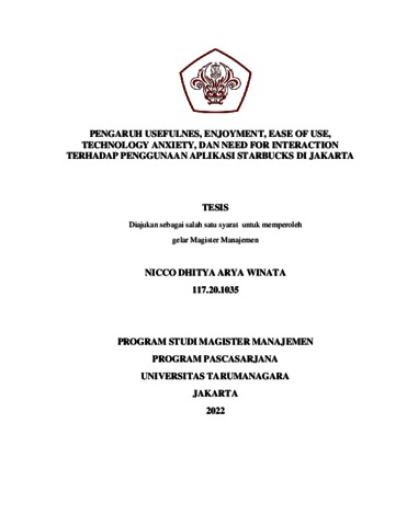 WINATA, NICCO DHITYA ARYA (2022) PENGARUH USEFULNES, ENJOYMENT, EASE OF USE, TECHNOLOGY ANXIETY, DAN NEED FOR INTERACTION TERHADAP PENGGUNAAN APLIKASI STARBUCKS DI JAKARTA. Masters thesis, Universitas Tarumanagara.