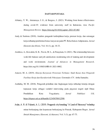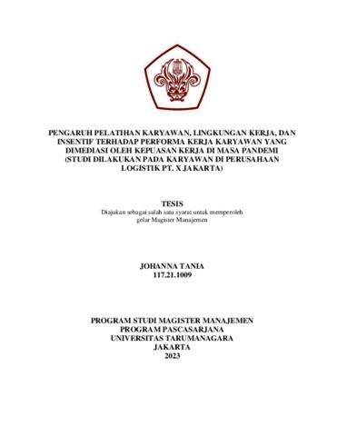 TANIA, JOHANNA (2022) PENGARUH PELATIHAN KARYAWAN, LINGKUNGAN KERJA, DAN INSENTIF TERHADAP PERFORMA KERJA KARYAWAN YANG DIMEDIASI OLEH KEPUASAN KERJA DI MASA PANDEMI (STUDI DILAKUKAN PADA KARYAWAN DI PERUSAHAAN LOGISTIK PT. X JAKARTA). Masters thesis, Universitas Tarumanagara.
