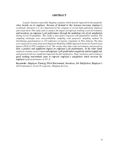 distributing questionnaires to 232 employees in logistic companies in West Jakarta. The data were analyzed by using Structural Equation Modeling (SEM) approach based on Partial Least Square (PLS) at 95% confidence level. The results show that work environment and incentives have a positive and significant impact on employee’s job performance. In the other hand, employee training seem to impacted employee’s job performance negatively and not significant, and positively but not significant impacted the job satisfaction. Thus, incentives and creating a good working environment seem to improve employee’s satisfaction which increase the employee’s job performance in PT. X.