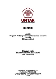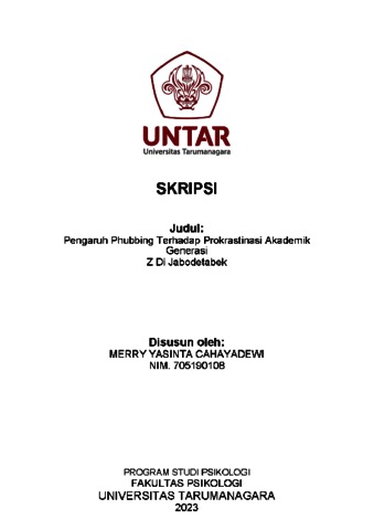 C, Merry Yasinta (2023) Pengaruh Phubbing terhadap Prokrastinasi Akademik Generasi Z di Jabodetabek. Skripsi thesis, Universitas Tarumanagara.