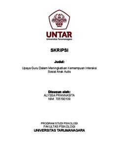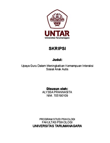 Prannasita, Alyssa (2023) Upaya Guru Dalam Meningkatkan Kemampuan Interaksi Sosial Anak Autis. Skripsi thesis, Universitas Tarumanagara.