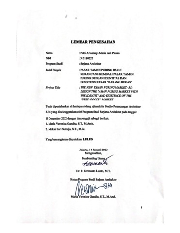 Pataka, Putri Arlastasya Maria Adi (2023) Pasar taman puring baru: merancang kembali pasar taman puring dengan identitas dan eksistensi pasar "Barang bekas" (ARS - 5309). Skripsi thesis, Universitas Tarumanagara.