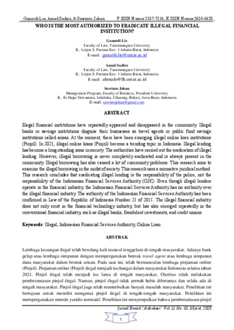 Gunardi, Lie and Sudiro, Amad and Johan, Suwinto Who is the Most Authorized to Eradicate Illegal Financial Institution? Jurnal Ilmiah Advokasi, 11 (1).