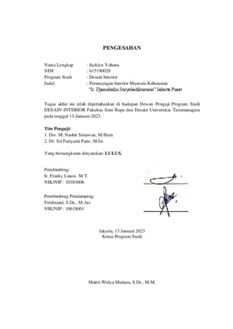 Yohana, Jacklyn (2023) Perancangan interior museum kehutanan "Ir. Djamaludin Suryohadikusumo" (DI - 2357). Skripsi thesis, Universitas Tarumanagara.