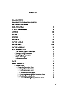 Pada masa sekarang ini penyebaran dan pertukaran informasi maupun hal-hal baru beserta masalah-masalah yang sifatnya universal terhadap kepentingan manusia selain melalui media massa, dapat juga dilaksanakan melalui pertemuan dan konvensi baik bersifat internasional, nasional, maupun regional. Dalam lingkup yang lebih kecil dapat juga dilaksanakan seperti pada perusahaan, kantor pemerintah, dan lain sebagainya. Convention Center secara umum merupakan gedung multifungsi yang memadukan fungsi eksibisi dan konferensi yang di dalamnya menawarkan area yang cukup untuk mengakomodasi ribuan pengunjung. Salah satu faktor yang mendorong penggunaan convention center adalah adanya pertemuan-pertemuan antara para profesional, negarawan, cendekiawan ataupun usahawan beserta tenaga kerja untuk meningkatkan hasil produksi baik secara nasional, regional, maupun internasional. Bangunan yang digunakan sebagai wadah kegiatan pertemuan, pertunjukan hingga pameran yang melibatkan banyak orang bahkan ratusan di setiap acara memerlukan penerapan interior yang dapat mengatasi kebutuhan ruang, ketersediaan fasilitas pada convention center dengan kualitas terhadap sirkulasi, fungsionalitas dan elemen pembentuk ruangan. Permasalahan di dapat dari kondisi eksisting proyek yaitu masih berupa bangunan kasar dan belum terdapat organisasi dan pembagian ruang yang mampu memfasilitasi aktivitas serta elemen estetika yang masih belum terlihat sehingga masih belum dapat menciptakan sebuah convention center yang memiliki nilai fungsional, estetika, dan komersial. Kata Kunci – Convention Center, Interior, fungsionalitas, internasional, estetika, komersial