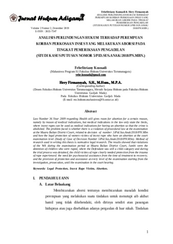 Kusnadi, Febefitriany and Firmansyah, Hery (2019) Analisis Perlindungan Hukum Terhadap Perempuan Korban Perkosaan Inses Yang Melakukan Aborsi Pada Tingkat Pemeriksaan Pengadilan (Studi Kasus Putusan Nomor 5/PID.SUS.ANAK/2018/PN.MBN.). Jurnal Hukum Adigama, 2 (2). ISSN 2655-7347