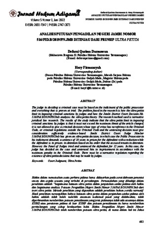 Darmawan, Defarai Qarima and Firmansyah, Hery (2022) Analisis Putusan Pengadilan Negeri Jambi Nomor 516PID.B2019PN.JMB Ditinjau Dari Prinsip Ultra Petita. Jurnal Hukum Adigama, 5 (1). ISSN E: 2655-7343, P: 2747-0873