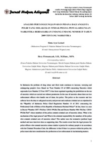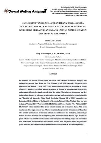Lestari, Sinta Ayu and Firmansyah, Hery Analisis Pertanggungjawaban Pidana Bagi Anggota Polri Yang Melakukan Tindak Pidana Penyalahgunaan Narkotika Berdasarkan Undang-Undang Nomor 35 Tahun 2009 Tentang Narkotika. Jurnal Hukum Adigama. ISSN E: 2655-7343, P: 2747-0873