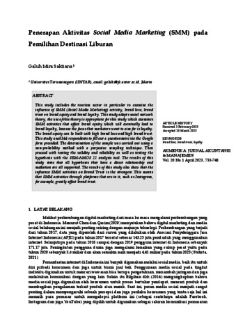 Penerapan Aktivitas Social Media Marketing (SMM) pada Pemilihan Destinasi Liburan, Akmenika April 2023.pdf Download (856kB) | Preview |