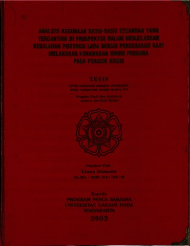 Liana Susanto, Tesis (2002) Analisis kegunaan rasio-rasio keuangan yang tercantum di prospektus dalam menjel;askan kesalahan proyeksi laba bersih perusahaan saat melakukan penawaran umum perdana pada periode krisis. Masters thesis, Universitas Tarumanagara.