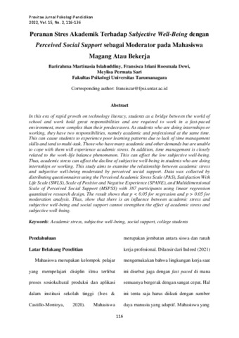 Roesmaladewi, Fransisca Iriani Peranan Stres Akademik Terhadap Subjective Well-Being dengan Perceived Social Support sebagai Moderator pada Mahasiswa Magang Atau Bekerja. Jurnal Muara Psikologi Pendidikan.