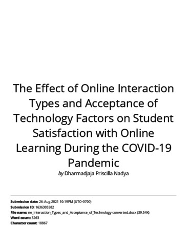 The Effect of Online Interaction Types and Acceptance of Technology Factors on Student Satisfaction with Online Learning During the COVID-19 Pandemic.pdf Download (1MB) | Preview |