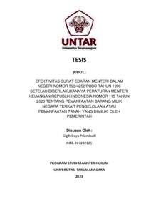 Priambudi, Gigih Dayu (2023) Efektivitas Surat Edaran Menteri Dalam Negeri Nomor 593/4252/PUOD Tahun 1990 setelah diberlakukannya Peraturan Menteri Keuangan Republik Indonesia Nomor 115 Tahun 2020 tentang Pemanfaatan Barang Milik Negara terkait Pengelolaan atau Pemanfaatan Tanah yang Dimiliki oleh Pemerintah. Masters thesis, Universitas Tarumanagara.