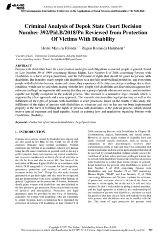 Felinda, Heski Manura (2021) Criminal Analysis of Depok State Court Decision Number 392/Pid.B/2018/Pn Reviewed from Protection Of Victims With Disability. Tarumanagara International Conference on The Aplications of Social Sciences and Humanities (TICASH). ISSN 2352-5398