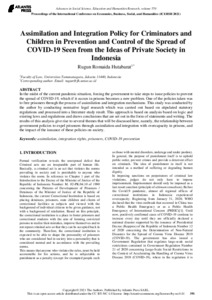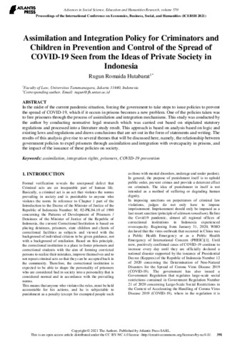 Hutabarat, Rugun Romaida (2021) Assimilation and Integration Policy for Criminators and Children in Prevention and Control of the Spread of COVID-19 Seen from the Ideas of Private Society in Indonesia. Proceedings of The International Conference on Economics, Business, Social, and Humanities (ICEBSH 2021). ISSN 2352-5398/978-94-6239-423-1