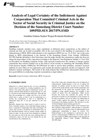 Septian, Jonathan Jodama and Hutabarat, Rugun Romaida (2021) Analysis of Legal Certainty of the Indictment Against Corporation That Commited Criminal Acts in the Sector of Social Security in Criminal Justice on the Decision of the Sumedang District Court Number 109/PID.SUS 2017/PN.SMD. Tarumanagara International Conference on The Aplications of Social Sciences and Humanities (TICASH). ISSN 2352-5398