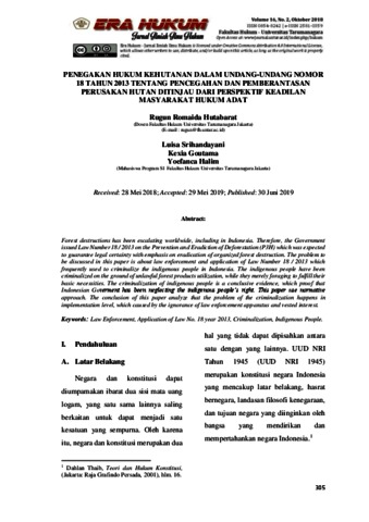 Hutabarat, Rugun Romaida and Srihandayani, Luisa and Goutama, Kexia and Halim, Yoefanca (2018) Penegakan Hukum Kehutanan Dalam Undang-Undang Nomor 18 Tahun 2013 Tentang Pencegahan Dan Pemberantasan Perusakan Hutan Ditinjau Dari Perspektif Keadilan Masyarakat Hukum Adat. Era Hukum Jurnal Ilmiah Ilmu Hukum. ISSN 0854-8242