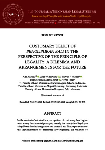 Adhari, Ade and Widyawati, Anis and Windia, I Wayan P and Hutabarat, Rugun Romaida and Tania, Neysa (2021) Customary Delict Of Penglipuran Bali In The Perspective Of The Principle Of Legality: A Dilemma And Arrangements For The Future. Journal of Indonesian Legal Studies.