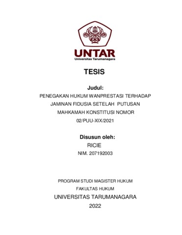 Ricie, Ricie (2023) Penegkan Hukum Wanprestasi Terhadap Jaminan Fidusia Setelah Putusan Mahkamah Konstitusi Nomor 2/PUU-XIX/2021. Masters thesis, Universitas Tarumanagara.