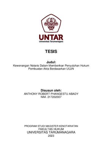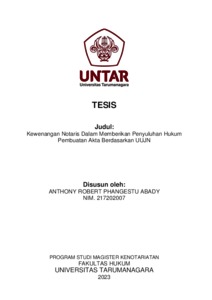 Abady, Anthony Robert Phangestu (2023) Kewenangan Notaris Dalam Memberikan Penyuluhan Hukum Pembuatan Akta Berdasarkan UUJN. Masters thesis, Universitas Tarumanagara.