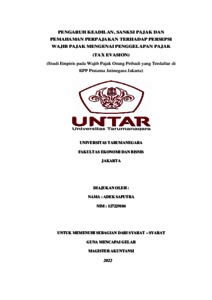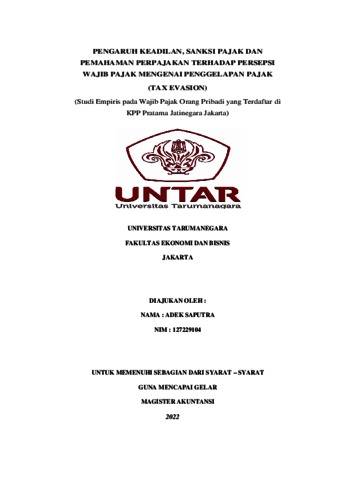 Saputra, Adek (2023) PENGARUH KEADILAN, SANKSI PAJAKDAN PEMAHAMAN PERPAJAKAN TERHADAPPERSEPSIWAJIBPAJAKMENGENAIPENGGELAPANPAJAK (TAXEVASION) (Studi Empiris pada Wajib Pajak Orang Pribadi yang Terdaftar di KPP Pratama Jatinegara Jakarta). Masters thesis, UNIVERSITAS TARUMANAGARA.