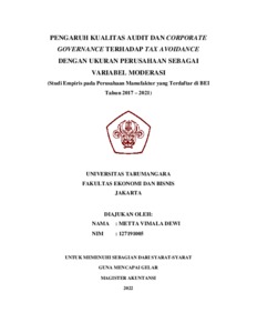 Dewi, Metta Vimala (2023) PENGARUH KUALITAS AUDIT DAN CORPORATE GOVERNANCE TERHADAP TAX AVOIDANCE DENGAN UKURAN PERUSAHAAN SEBAGAI VARIABEL MODERASI (Studi Empiris pada Perusahaan Manufaktur yang Terdaftar di BEI Tahun 2017 – 2021). Masters thesis, UNIVERSITAS TARUMANAGARA.