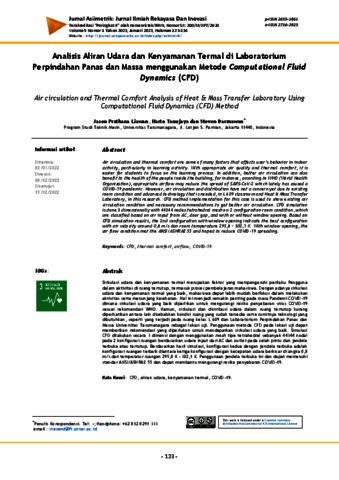 Darmawan, Steven and Liawan, Jason Prathana and Tanujaya, Harto (2023) Analisis Aliran Udara dan Kenyamanan Termal di Laboratorium Perpindahan Panas dan Massa menggunakan Metode Computational Fluid Dynamics (CFD). Jurnal Asiimetrik: Jurnal Ilmiah Rekayasa Dan Inovasi, 5 (1). pp. 123-134. ISSN 2655-1861