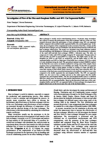 Darmawan, Steven and Tanujaya, Harto (2021) Investigation of Flow of the Disc-and-Doughnut Baffles and 40% Cut Segmental Baffles. International Journal of Heat and Technology, 39 (5). pp. 1541-1548.