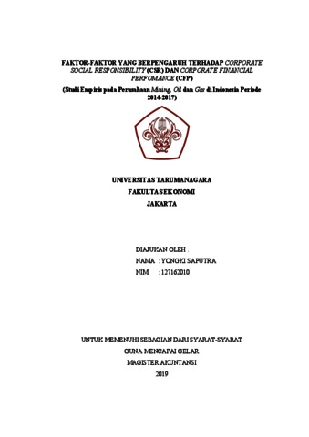 Saputra, Yongki (2019) FAKTOR-FAKTOR YANG BERPENGARUH TERHADAP CORPORATE SOCIAL RESPONSIBILITY (CSR) DAN CORPORATE FINANCIAL PERFOMANCE (CFP) (Studi Empiris pada Perusahaan Mining, Oil dan Gas di Indonesia Periode 2014-2017). Masters thesis, UNIVERSITAS TARUMANAGARA.