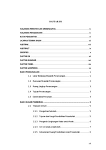 Periode penting dalam proses tumbuh kembang anak adalah masa lima tahun pertama. Masa ini merupakan masa kehidupan emas individu atau disebut dengan the golden periode. Pada masa ini anak lebih terbuka untuk pembelajaran dan menyerap segalah bentuk informasi. anak berada dalam kesempatan untuk mengasah seluruh aspek perkembangannya di masa golden periode. Anak usia prasekolah berada dalam periode dimana perkembangan otak berkembang secara pesat dalam hal belajar beradaptasi dengan lingkungan sekitar dan juga bersosialiasi dengan sesama. Oleh karena itu, interior sekolah seharusnya memiliki desain yang dapat mendukung anak dalam mengeksplor dan membantu perkembangan anak dalam berkreatifitas. Elemen interior berperan menciptakan suasana ruang sesuai dengan fungsinya, juga untuk menunjang semangat dan minat belajar anak. Metode perancangan yang digunakan adalah metode yang dipelopori oleh Rosemary kilmer yang terdiri dari 8 tahap (Commit, Ideate, State , Choose, Collect, Implement, Analyze dan Evaluate ). Untuk konsep suasana yang diharapkan dalam Perancangan Interior Blossom School, diharapkan dapat menciptakan ruangan yang menyenangkan, kreatif, aman, nyaman dan secara fisik, visual, ergonomi, maupun psikologi guna merangsang timbulnya minat anak dalam belajar dan eksplorasi, guna memicu kreatifitas, memudahkan aktifitas, serta menunjang kebutuhan anak-anak. Kata Kunci: Elemen, Ergonomi, Interior, Prasekolah, Psikologi, Visual