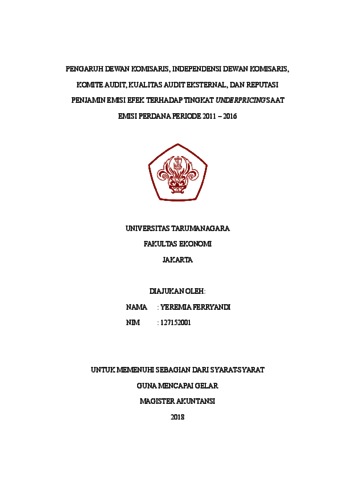 Ferryandi, Yeremia (2018) PENGARUH DEWAN KOMISARIS, INDEPENDENSI DEWAN KOMISARIS, KOMITE AUDIT, KUALITAS AUDITOR EKSTERNAL DAN REPUTASI PENJAMIN EMISI EFEK TERHADAP TINGKAT UNDERPRICING SAAT EMISI PERDANA PERIODE 2011 – 2016. Masters thesis, UNIVERSITAS TARUMANAGARA.