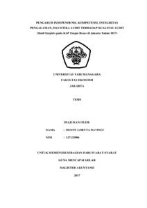 Davinci, Denny Loryta (2017) PENGARUH INDEPENDENSI, KOMPETENSI, INTEGRITAS PENGALAMAN, DAN ETIKA AUDIT TERHADAP KUALITAS AUDIT (Studi Empiris pada KAP Empat Besar di Jakarta Tahun 2017). Masters thesis, UNIVERSITAS TARUMANAGARA.