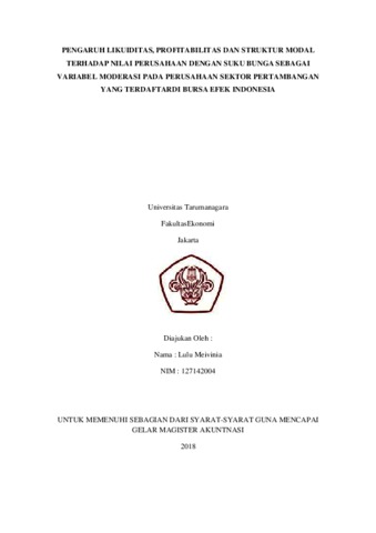Meivinia, Lulu (2018) PENGARUH LIKUIDITAS, PROFITABILITAS DAN STRUKTUR MODAL TERHADAP NILAI PERUSAHAAN DENGAN SUKU BUNGA SEBAGAI VARIABEL MODERASI PADA PERUSAHAAN SEKTOR PERTAMBANGAN YANG TERDAFTARDI BURSA EFEK INDONESIA. Masters thesis, UNIVERSITAS TARUMANAGARA.