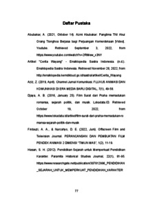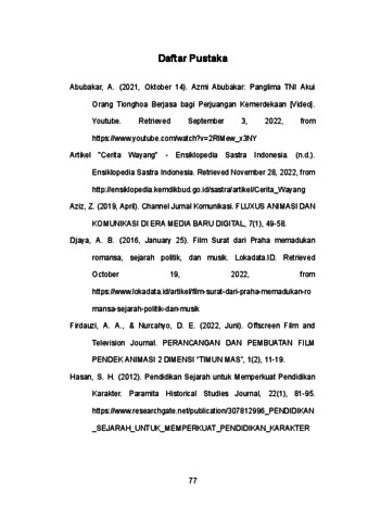 Mempelajari sejarah merupakan hal yang penting karena dengan mengetahui apa yang terjadi di masa lalu, di masa kini kita bisa berpikir dan bertindak sesuai dengan pelajaran yang ada dari masa lalu agar di masa depan kita tidak mengalami kejadian tragis yang sama seperti masa lalu. Indonesia yang majemuk dan serba beragam ini memiliki banyak cerita sejarah yang dapat diangkat agar bisa memberikan pemahaman di masa depan kepada warga Indonesia. Salah satunya adalah peristiwa sejarah Geger Pecinan di Batavia tahun 1740. Memang peristiwa ini cukup tragis untuk diangkat kembali, tetapi peristiwa ini memiliki pesan yang cukup kuat agar tidak terjadi hal yang sama di masa depan. Maka dari itu, penulis menggunakan media boneka kertas dengan narasi tokoh fiktif agar orang lebih tertarik dengan kejadian bersejarah ini. Beberapa adegan kejadian tragis mengikuti peristiwa Geger Pecinan di Batavia tahun 1740, peristiwa sejarah tidak terasa membosankan dan kejadian tragisnya dapat diperhalus dengan media karya yang dibuat penulis. Penulis menggunakan berbagai metode penelitian untuk mengetahui bentuk apa yang tepat untuk menjelaskan Geger Pecinan Tahun 1740, beberapa diantaranya adalah observasi, analisa karya terdahulu, kuesioner, dan wawancara. Kata kunci: Sejarah, Geger Pecinan, Boneka Kertas, Memperhalus, Menarik