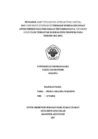 Warsono, Prisca Jolanda (2017) PENGARUH ASSET UTILIZATION, INTELLECTUAL CAPITAL, DAN CORPORATE GOVERNANCE TERHADAP KINERJA KEUANGAN (STUDI EMPIRIS PADA PERUSAHAAN PERTAMBANGAN & CONSUMER GOODS YANG TERDAFTAR DI BURSA EFEK INDONESIA PADA PERIODE 2012-2015). Masters thesis, UNIVERSITAS TARUMANAGARA.