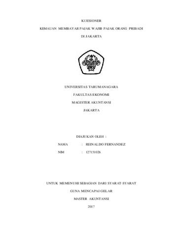 Lesamana, Reinaldo Fernandes (2017) KUESIONER KEMAUAN MEMBAYAR PAJAK WAJIB PAJAK ORANG PRIBADI DI JAKARTA. Masters thesis, UNIVERSITAS TARUMANAGARA.
