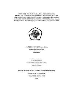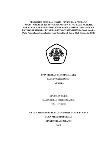 April, Belle Colleen (2015) PENGARUH BESARAN USAHA, FINANCIAL LEVERAGE, PROFITABILITAS dan DIVIDEND PAYOUT RATIO PADA PRAKTIK PERATAAN LABA PERUSAHAAN DENGAN MEMPERTIMBANGKAN KATEGORI SEBAGAI KONTRAS (INCOME SMOOTHING): Studi Empiris Pada Perusahaan Manufaktur yang Terdaftar di Bursa Efek Indonesia (BEI). Masters thesis, UNIVERSITAS TARUMANAGARA.