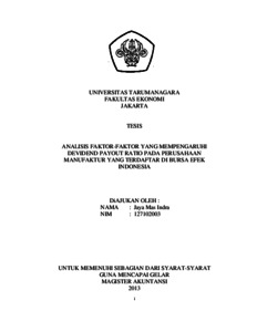Indra, Jaya Mas (2013) ANALISIS FAKTOR-FAKTOR YANG MEMPENGARUHI DEVIDEND PAYOUT RATIO PADA PERUSAHAAN MANUFAKTUR YANG TERDAFTAR DI BURSA EFEK INDONESIA. Masters thesis, UNIVERSITAS TARUMANAGARA.