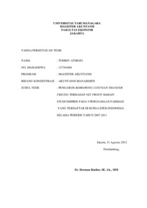 Atmojo, Tommy (2013) PENGARUH BORROWING COST DAN TRANSFER PRICING TERHADAP NET PROFIT MARGIN STUDI EMPIRIS PADA 9 PERUSAHAAN FARMASI YANG TERDAFTAR DI BURSA EFEK INDONESIA SELAMA PERIODE TAHUN 2007-2011. Masters thesis, UNIVERSITAS TARUMANAGARA.